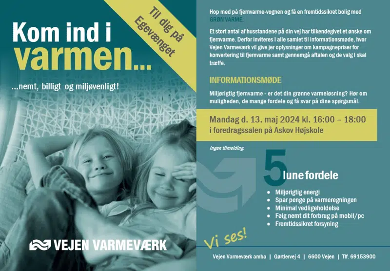 Vejen Varmeværk har derfor afholdt informationsmøde for husstandene på Egevænget. Interesserede husstande kan herefter booke et besøg af Vejen Varmeværk for at gennemgå hustandens individuelle løsning. Vi ønsker nemlig kun at levere fjernvarme til dig, hvis vi selv er overbeviste om, at det er den bedste løsning for begge parter.